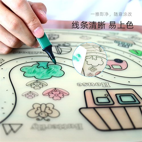 材料環保柔軟,矽膠墊廠家采(cǎi)用優質食(shí)品級矽膠材(cái)料(liào)生產加工,經過高溫200度將(jiāng)模紙轉印二次成型達到表麵底色圖案效果,過200度高溫具有優良附著力,多種創作思維底色圖案,可鍛煉兒童的思維能(néng)力以及創作能(néng)力,優質水性筆不留筆汙色痕,可可隨意塗改反複使用,反複塗鴉!